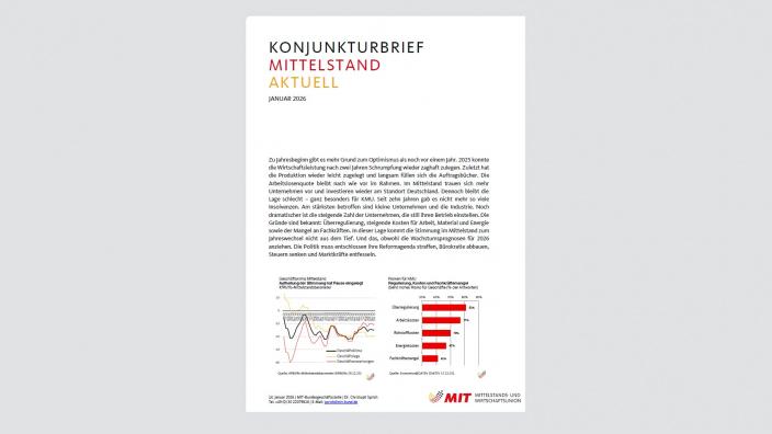 Zu Jahresbeginn gibt es mehr Grund zum Optimismus als noch vor einem Jahr. 2025 konnte die Wirtschaftsleistung nach zwei Jahren Schrumpfung wieder zaghaft zulegen. Zuletzt hat die Produktion wieder leicht zugelegt und langsam füllen sich die Auftragsbücher. Die Arbeitslosenquote bleibt nach wie vor im Rahmen. Im Mittelstand trauen sich mehr Unternehmen vor und investieren wieder am Standort Deutschland. Dennoch bleibt die Lage schlecht – ganz besonders für KMU. Seit zehn Jahren gab es nicht mehr so viele Insolvenzen. Am stärksten betroffen sind kleine Unternehmen und die Industrie. Noch...