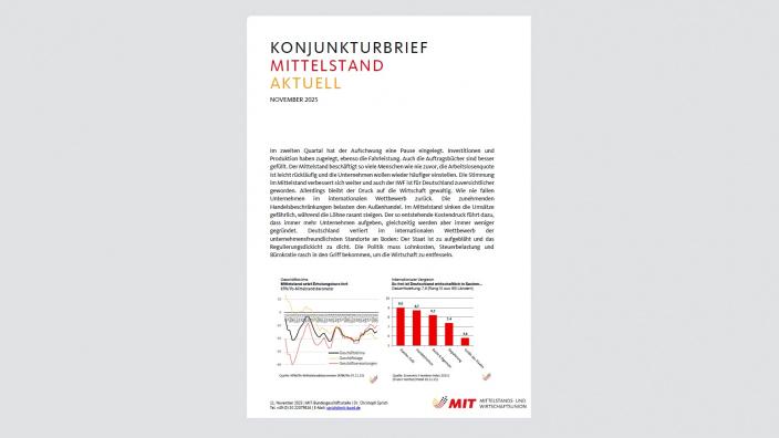 Der Mittelstand geht verschnupft in den Herbst. Wirtschaftsleistung und Produktion sind zuletzt geschrumpft, Auftragslage, Exporte und Fahrleistung entwickeln sich negativ. Die Insolvenzen bleiben auf hohem Niveau, seit Jahren waren nicht mehr so viele Beschäftigte von den Schließungen betroffen. Immerhin nehmen Arbeitslosigkeit und Inflation bislang nur sehr moderat zu. Für die Unternehmen bleiben hohe Arbeits- und Energiekosten sowie Bürokratielasten die großen Probleme. Es ist zu hoffen, dass die wirtschafts- und finanzpolitischen Maßnahmen der Bundesregierung in den kommenden Monaten...
