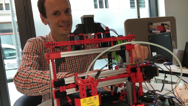 Es kostete ein wenig Zeit, den Bausatz zusammenzufügen, aber das Ergebnis kann sich sehen lassen: Nach wenigen Minuten konnten wir uns einen Schlüsselanhänger und einen Einkaufschip mit MIT-Logo selbst „ausdrucken“. Dabei werden dünne Fäden aus geschmolzenem (und sehr preiswertem) Plastik geschichtet. Wir freuen uns schon auf das Staunen unserer nächsten Gäste und Besuchergruppen.