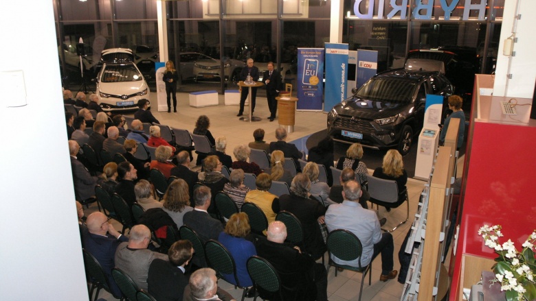 In Nordrhein-Westfalen geht es voran. „Das ist nicht zuletzt ein Verdienst der unionsgeführten Landesregierung“, betonte Marco Morten Pufke, CDU-Kreisvorsitzender, in seinen einleitenden Worten am Sonntagabend, 03.02.19, im Kamener Autohaus Muermann. Besonders freue ihn, dass die Veränderungen zum Besseren bei der Bevölkerung ankommen und wahrgenommen würden. Die Kreisverbände der CDU und der Mittelstands- und Wirtschaftsvereinigung der CDU (MIT) hatten NRW-Finanzminister Lutz Lienenkämper MdL in den Kreis Unna eingeladen, um darüber zu sprechen, was sich seit dem Regierungswechsel im Juni 2017 getan hat und darüber, was sich noch tun muss. Mit diesem Themenkomplex erreichten die beiden Veranstalter annähernd 160 Interessierte, die nicht nur dem kurzweiligen Impulsvortrag des Ministers aufmerksam lauschten. Auch in der anschließenden, vom MIT-Kreisvorsitzenden Frank Murmann moderierten Diskussionsrunde waren die Gäste mit Engagement dabei. Lienenkämper erläuterte den ausgewogenen Dreiklang, den er angesichts der nach wie vor guten Konjunktur mit seiner Finanzpolitik verfolgt: „Wir machen es wie der Mittelstand. Wir wirtschaften sorgfältig, mit Augenmaß und auf die Zukunft gerichtet. Für unsere Verpflichtungen, z. B. aus der Abwicklung der WestLB, stellen wir die nötigen Mittel bereit. Außerdem bilden wir Rücklagen für schlechtere Zeiten. Und wir investieren: In Bildung, Infrastruktur, Sicherheit, Digitalisierung und in die Kommunen.“ Sichtbar sei das unter anderem an der besseren Ausstattung der Polizei, die diese auch brauche, um zum Beispiel die Clankriminalität erfolgreich zu bekämpfen. 16.000 zusätzliche Plätze im offenen Ganztag, eine auskömmliche Finanzierung der Kindertagesstätten, die Einführung eines zweiten beitragsfreien Kindergartenjahrs und die Schaffung von 9.000 neuen Lehrerstellen gehörten ebenso zum Programm der NRW-Koalition aus CDU und FDP wie die Aufstockung der Freibeträge für Übungsleiter in Vereinen. Zur Baustellenproblematik bat der Minister um Verständnis: „Wer baut, ausbaut oder saniert, der verursacht Baustellen. Das ist nun mal so.“ „Die Unternehmer wollen übrigens am liebsten in Ruhe gelassen werden“, verkündete Lienenkämper dem Publikum. „Denen helfen wir am besten, indem wir weiter überflüssige Vorschriften abschaffen und dafür sorgen, dass Genehmigungsverfahren flotter laufen.“ Trotz aller Investitionen sei aber eines klar: „Wir werden bis zum Ende der Legislaturperiode keine neuen Schulden machen, sondern alte Schulden abbauen. So gelingt es uns, Handlungsspielräume für die kommenden Jahre zu erreichen.“ Foto 1: CDU Kreisverband Unna, Freigabe ist hiermit erteilt Auf dem Foto von links nach rechts: Frank Murmann, MIT-Kreisvorsitzender, Marco Morten Pufke, CDU-Kreisvorsitzender, Lutz Lienenkämper, Minister der Finanzen NRW, Eva Muermann, Verwaltung Autohaus Muermann, Matthias Muermann, Geschäftsleitung Autohaus Muermann Fotos 2+3: Ralf Eisenhardt