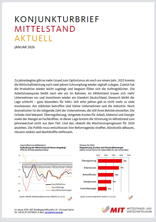 Geschäftsklima: Das Geschäftsklima der KMU beschließt das Jahr 2025 mit einem kleinen Rückgang. Damit verharrt die Unternehmensstimmung unterhalb des langfristigen Durchschnitts (KfW/ifo 29.12.25). Bei den Selbstständigen erwarten mehr als ein Drittel (35,3%) eine Verschlechterung der eigenen wirtschaftlichen Lage, nur 14% rechnen mit einer Verbesserung (ifo 13.01.25).