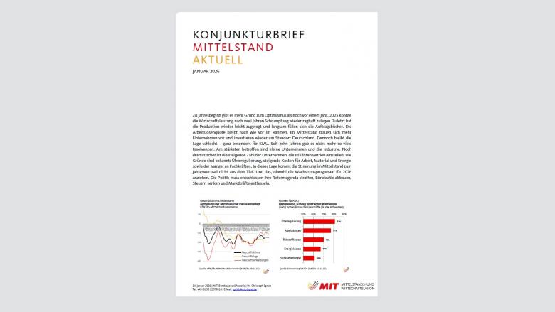 Standortwettbewerb: Die größten wirtschaftlichen Risiken für KMU sind derzeit Überregulierung und Bürokratie mit (80,9%), steigende Arbeitskosten (77,3%), Rohstoffkosten (70%), Energiekosten (67%) und Fachkräftemangel (52%). Die für KMU sinnvollsten politischen Maßnahmen wären Bürokratieabbau (77,1%), Steuerentlastung (73,8%) und Investitionen in Infrastruktur (62,9%) (DATEV 18.12.25). Einen Wachstumsimpuls durch die Fiskalpakete erwarten 37% der Befragten (DZ Bank 16.12.25).