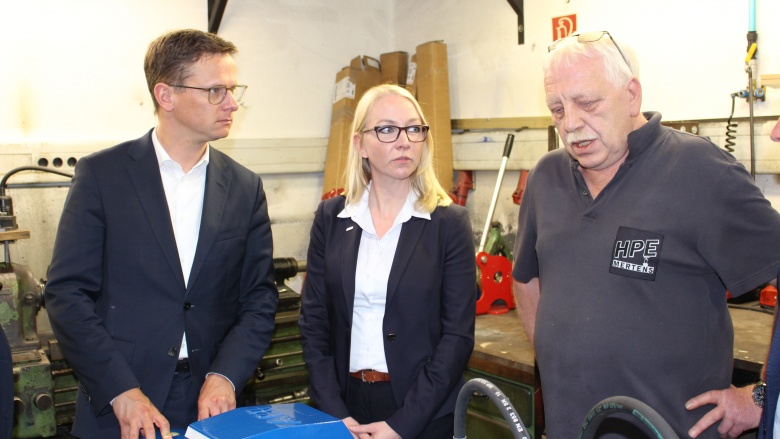 Linnemann, der auch stellvertretender Vorsitzender der CDU/CSU-Bundestagsfraktion ist, zeigte sich von dem seit 20 Jahren existenten Sieben-Mann-Unternehmen für die Bereiche Hydraulik, Pneumatik und Elektronik beeindruckt. Die Geschäftsführer Michael Mertens und Robin Benecke standen Rede und Antwort. 2009 entwickelten Mertens und Benecke eine Hydraulikanlage für Glas- und Steinmühlen. Gerade die Sorgen und Nöte kleiner und mittlerer Unternehmen interessierten den MIT Bundesvorsitzenden, da sie vielfach in der öffentlichen Wahrnehmung und Berichterstattung zu kurz kämen. Bürokratische Hemmnisse wie die Bestimmungen der Datenschutzgrundverordnung (DSGVO), die Facharbeitersituation, aber auch die Unklarheiten im Zuge des zu erwarteten BREXITs belasteten. „Wir machen das, wo andere bereits kapituliert haben“, so Michael Mertens. „Für unsere Auftraggeber ist HPE so etwas wie eine Feuerwehr, wenn’s brennt.“, so Mertens weiter. An der Firmenbesichtigung nahmen auch teil Vorständler der MIT Wedemark, des MIT Kreisverbandes Hannover-Land und des MIT-Bezirksvorstandes Hannover. Foto: Andreas Sobotta, Hannover (Veröffentlichung honorarfrei) (v.l.n.r.): Dr. Carsten Linnemann MdB, Silke Hanebuth vom Vorstand der MIT Wedemark und Firmenchef Michael Mertens im Gespräch.