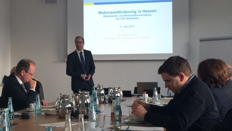 Dr. Harald Schlee, Abteilungsleiter der WIBank für Wohnbauförderung, erläuterte Fördermöglichkeiten, Hans-Martin Kessler, Vorsitzender des Ausschusses Planung, Bau und Verkehr der Stadtverordnetenversammlung und stellv. CDU-Fraktionsvorsitzender im Wiesbadener Rathaus sprach über die Situation in Wiesbaden und wies auf mangelnde Flächenausweisung und langwierige Genehmigungsprozesse für Bauvorhaben hin.