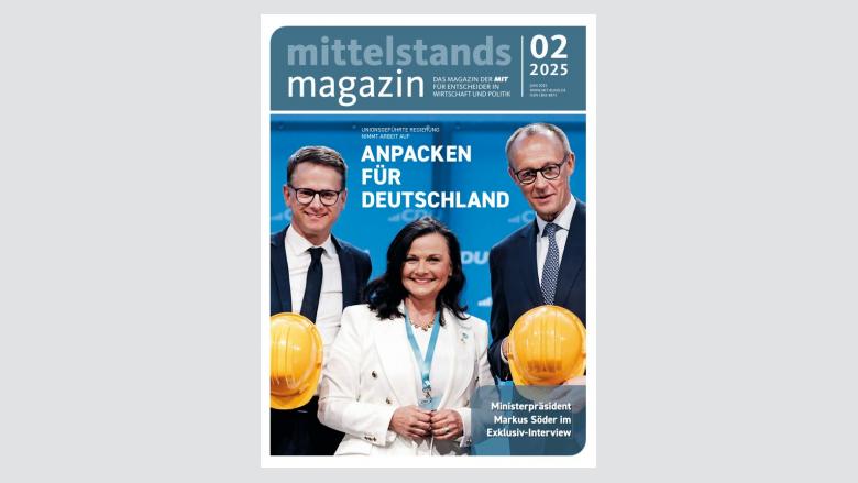 Das neue Mittelstandsmagazin ist da! In dieser Ausgabe geht es um den Start der neuen unionsgeführten Bundesregierung und ihre Neustart-Agenda für unser Land. Außerdem lesen Sie ein exklusives Interview mit dem bayerischen Ministerpräsidenten Dr. Markus Söder über die politischen Anforderungen der nächsten Jahre, den notwendigen Mentalitätswandel in Deutschland und warum die Abgrenzung zu den Grünen notwendig war.