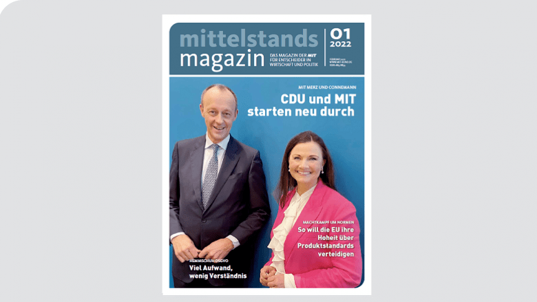 Eine neue Ausgabe des Mittelstandsmagazins ist da. Nach dem CDU-Parteitag und dem Bundesmittelstandstag dreht sich die Ausgabe um den Neustart in CDU und MIT. Außerdem im Heft: Machtkampf um Normen - So will die EU ihre globale Hoheit über Produktstandards verteidigen. Hemmschuh Datenschutz: Die Verunsicherung über die DSGVO ist noch immer groß. 125 Jahre Ludwig Erhard: Was uns der Ideengeber der Sozialen Marktwirtschaft heute noch zu sagen hat u.v.m.