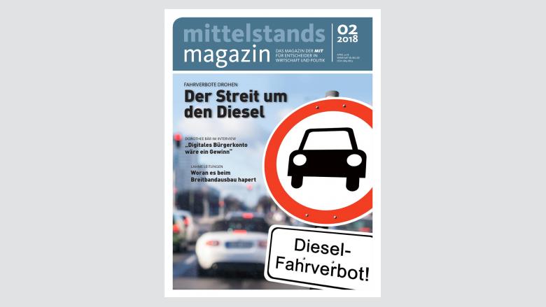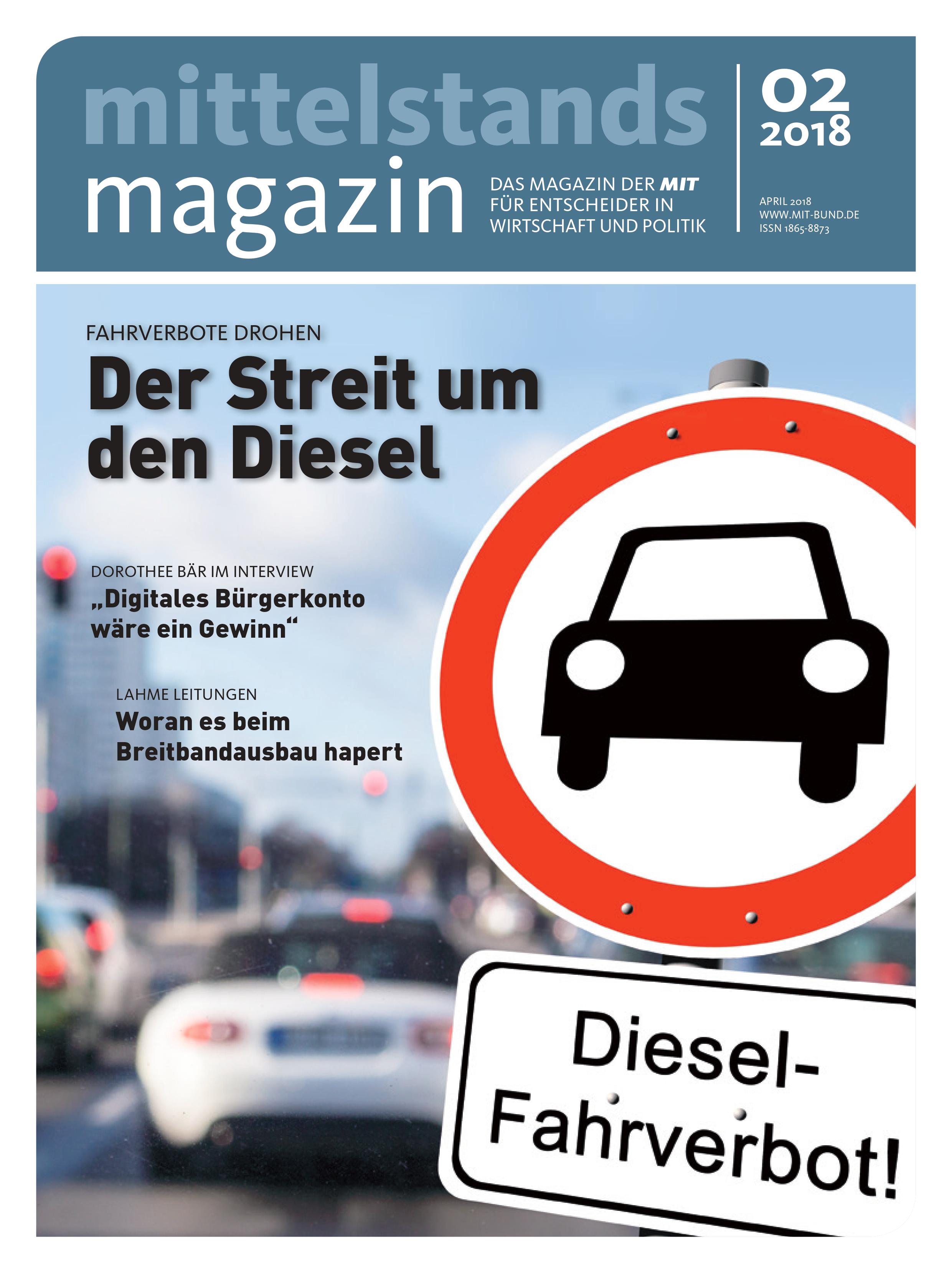 Die Ausgabe 2/2018 des Mittelstandsmagazins ist online. Das Titelthema dreht sich um den aktuellen Diesel-Streit und drohende Fahrverbote. Die neue Digital-Staatsministerin Dorothee Bär spricht im Interview über unsere MIT-Forderung nach einem einheitlichen digitalen Bürgerkonto. Außerdem im Heft: Woran es beim Breitbandausbau hapert und worum es beim Handelsstreit zwischen den USA, China und dem Rest der Welt geht.