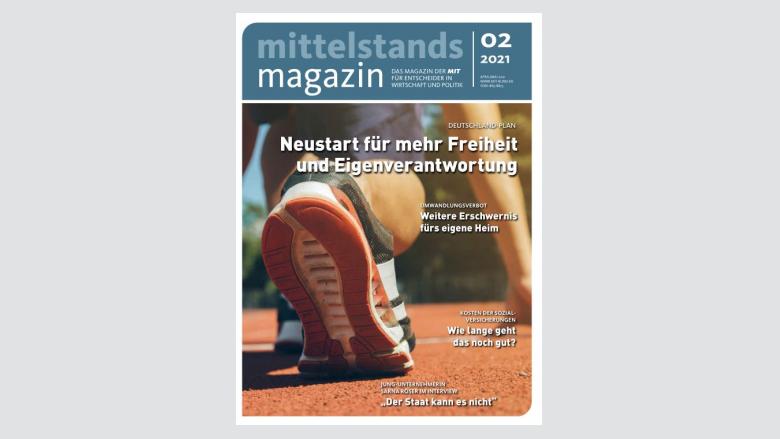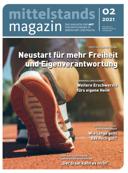 Eine neue Ausgabe des Mittelstandsmagazins ist da. Im Interview kritisiert die Unternehmerin Sarna Röser die Coronapolitik: "Der Staat kann es nicht". Außerdem: Wie das Umwandlungsverbot den Erwerb von Eigenheimen erschwert. Und wir widmen uns den Sozialversicherungen, deren Finanzierung an ihre Grenzen stößt.
