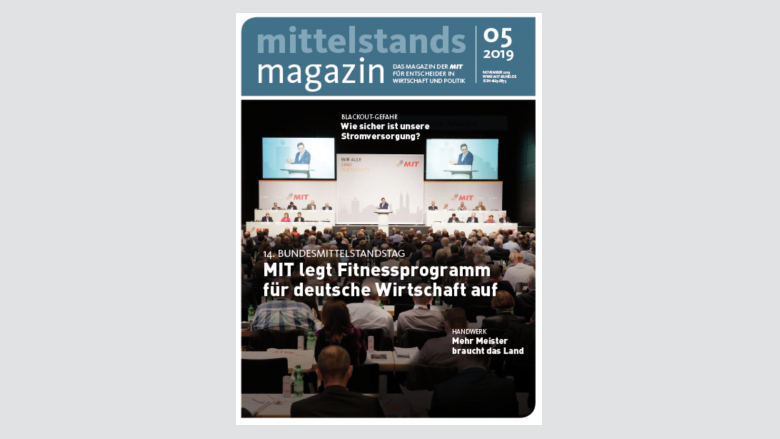 Eine neue Ausgabe des Mittelstandsmagazins ist da. Im Fokus steht der 14. Bundesmittelstandstag: Die MIT legt ein Fitnessprogramm für die deutsche Wirtschaft auf. Außerdem diskutiert Bundesgesundheitsminister Jens Spahn mit Gesamtmetall-Präsident Rainer Dulger über die Wirtschaftspolitik. Weitere Themen im Heft: Wie sicher ist unsere Stromversorgung? Was nutzt die Wiedereinführung der Meisterpflicht? Und was taugt das Klimapapier der großen Koalition?