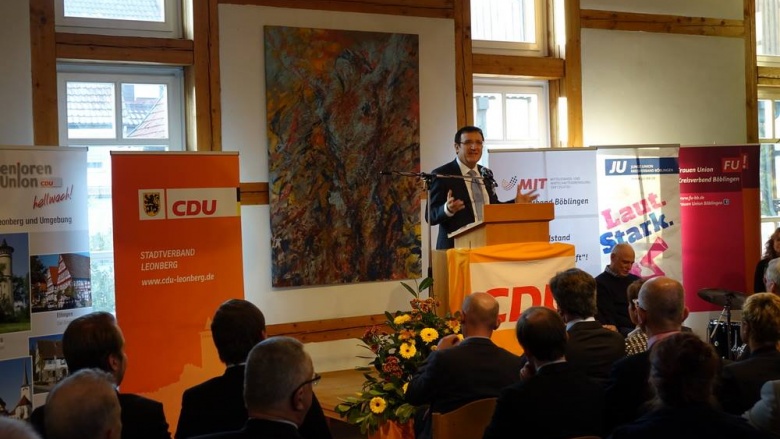 Der Hauptredner Professor Dr. Wolfgang Reinhart, Fraktionsvorsitzender der CDU Landtagsfraktion in Baden-Württemberg sprach über die Vorzüge in Deutschland. In Baden-Württemberg herrsche quasi Vollbeschäftigung. Als Innovationsregion rangiere das Land noch vor Bayern und der Region île-de-France rund um Paris. Das gesunde Wirtschaftswachstum der vergangenen Jahre setze sich fort: „Uns geht es gut, die Stimmung ist schlechter als die Lage.“ Ausländische Wissenschaftler würden Deutschland in Sachen Lebensqualität, Wohlstand und Wirtschaft bisweilen als „das beste Land der Welt“ bezeichnen. Die Veranstaltung fand im Evangelischen Gemeindezentrum in Leonberg-Eltingen statt. Als Gastgeber empfahl Pfarrer Dennis Müller den Christdemokraten, sich von Jesus inspirieren zu lassen: „Jesus sprach in einfachen Bildern und erzählte Geschichten, die das Volk verstand.“ Dennoch seien Lösungen alles andere als einfach: „Oder ist Feindesliebe mainstreamfähig?“