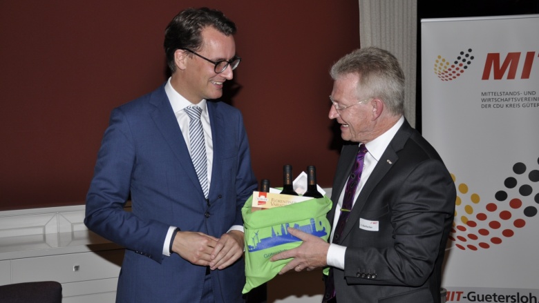 Wüst kündigte an, den Problemen mit einer großen Einstellungswelle an Ingenieuren und Technikern zu begegnen. Außerdem sollen die Erhaltungsmittel für Landesstraßen auf 200 Millionen Euro jährlich hochgefahren werden. Auch für den Kreis Gütersloh hatte der Verkehrsminister gute Nachrichten dabei: Ende des Jahres soll feststehen, wann mit dem Ausbau der B 64 begonnen wird. Beim öffentlichen Nahverkehr setzt Wüst auf das Stichwort „vernetzte Mobilität“. Die Digitalisierung sei eine große Chance, die Angebote von Bus und Bahn besser zu koordinieren. Eher zurückhaltend ist der Verkehrsminister bei der Elektromobilität. „Wir werden die Verbrennungsmotoren noch lange brauchen. Leistungsstarke Lastkraftwagen, Schiffe oder Flugzeuge mit Elektroantrieb sind noch nicht denkbar. Und auch hinter der großflächigen Nutzung von Elektro-PKWs stehen noch viele Fragezeichen“, so Wüst. Daher sei es wichtig, nicht nur die Elektromotoren, sondern auch die Verbrennungsmotoren weiterzuentwickeln.