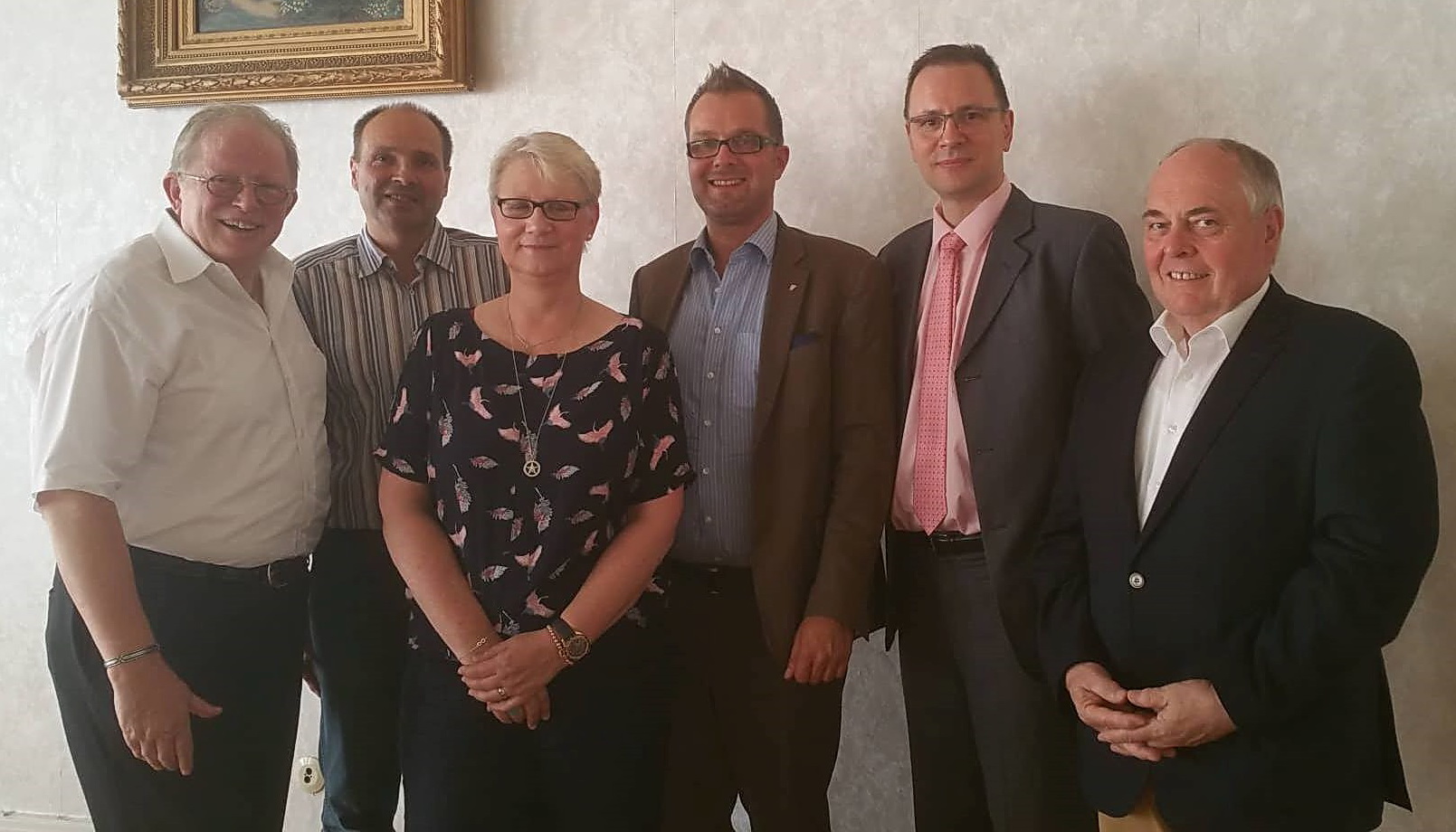 Besonders begrüßt wurden Sabine Kleinke, Landesvorsitzende der MIT Braunschweig, und Andreas Sobotta, Hauptgeschäftsführer der Niedersachsen-MIT, der auch die Wahlen leitete. Die enge Zusammenarbeit mit der Braunschweiger MIT habe sich bewährt. „Wir werden diese Gemeinsamkeit weiterentwickeln. Dazu gehören Aktivitäten und gemeinsame Veranstaltungen zu mittelstandsrelevanten Themen“, so Faustmann. Im letzten Jahr konnten gemeinsame Besuche des neu gestalteten Landtags in Hannover samt guten Gesprächen mit den MIT-Mitgliedern und CDU-Landtagsabgeordneten Oliver Schatta und Christoph Plett realisiert werden. Etliche Unternehmensbesichtigungen u.a. in der Braumanufaktur Härke, auf dem Forschungsflughafen Braunschweig in den Forschungseinrichtungen der DLR Deutschen Luft und Raumfahrtforschung fanden statt. Gemeinsame Vorstandssitzungen und Teilnahmen an Landes- und Bundesmittelstands-tages trugen zur einer verbesserten Vernetzung des Mittelstandes untereinander bei. Der jetzt komplettierte Vorstand der MIT Peine sieht sich kritischer Mahner nach den Prinzipien der Sozialen Marktwirtschaft. Er will als Sprachroher der Selbständigen, Handwerker, Gewerbetreibenden, Landwirte, Freiberufler, Unternehmer und Unternehmerinnen wirken und im stetigen Dialog mit der Politik, Wirtschaft, Wissenschaft und Verwaltung in der Region stehen. Die MIT will eine sinnvolle Ergänzung bereits vorhandener Wirtschaftsverbände in und um Peine sein. Oft werde die mangelnde Zusammenarbeit von Vereinigungen gerügt, so dass die Interessenvertretung häufig an den Gebietsgrenzen endet. Mit der erfolgreich gelebten Zusammenarbeit zeigten die Kreisgliederungen der MIT Braunschweig und Peine, dass eine Kooperation im Interesse beider Kommunen, deren Bürger und Unternehmen möglich ist. „Das haben wir gefördert und gefordert“, sagte Faustmann. Als größere Veranstaltung wird für den 26. August von 11.00 bis 14.00 Uhr ein Jazz-Frühshoppen auf dem Rittergut in Oberg vorbereitet. Nach den Wahlgängen kürzlich im Theater-Restaurant der Peiner Festsäle (v.l.n.r.): Andreas Sobotta, Hauptgeschäftsführer der Niedersachsen-MIT, Berthold Mühlbach, Kreisschatzmeister, Sabine Kleinke, stellvertretende Landesvorsitzende der Niedersachsen-MIT, Tim Faustmann, neuer Vorsitzender MIT Peine, Matthias Kunze–Dücker und Michael Heinemann.